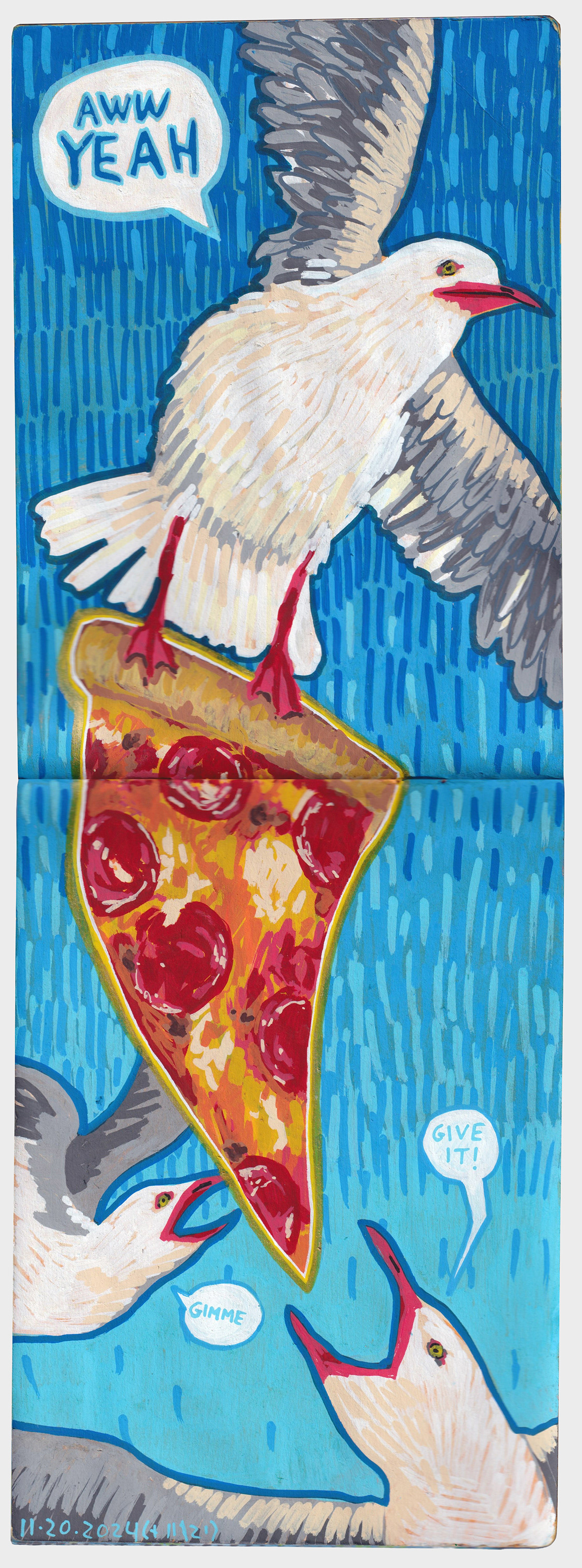 On the way to work I watched a seagull take off with an entire slice of pizza while a bunch of other seagulls chased after him. I was proud of him, so I needed to commemorate his victory.