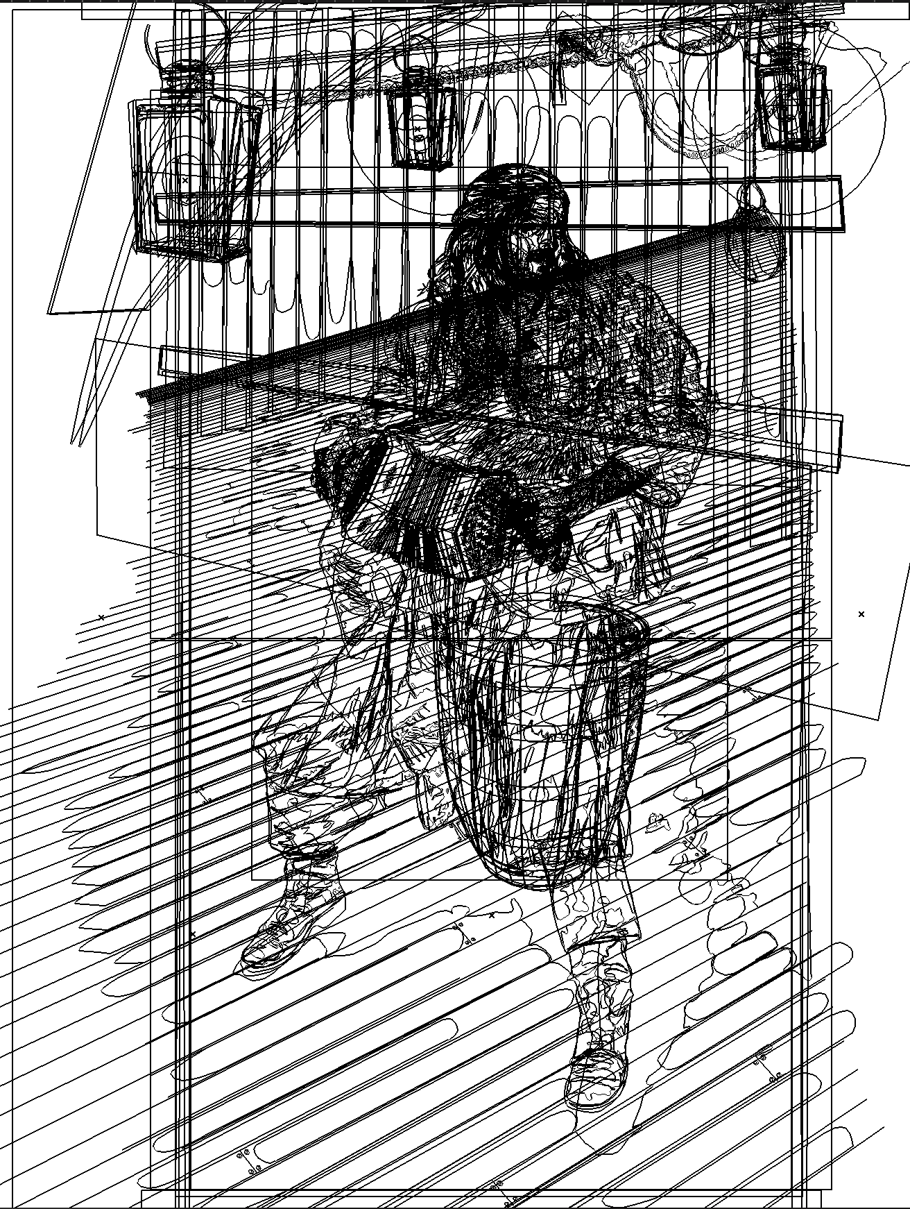 The whole drawing in outline mode. Even on my 22" Cintiq, a lot of the most detailed areas are solid black.